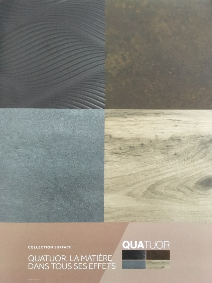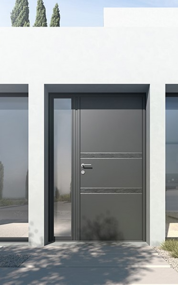 QUATUOR, un principe décoratif de 4 finitions : pour un même modèle, la porte d'entrée s'habille de 3 céramiques différentes (BETON,OXYDE,BOIS), ou encore de la surprenante finition ONDE, sculptée dans la tôle aluminium.