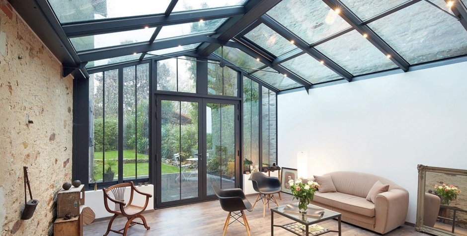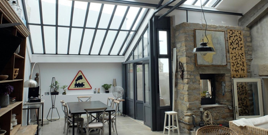 La véranda affirme son caractère et son orignialité grâce à ses chevrons IPN de style industriel. Qu'ils soient pleins ou perforés, ces chevrons, associés à un chéneau et à des châssis aux lignes franches, apportent immédiatement un esprit "atelier d'artiste" à la véranda. La toiture est invisible de l'extérieur.